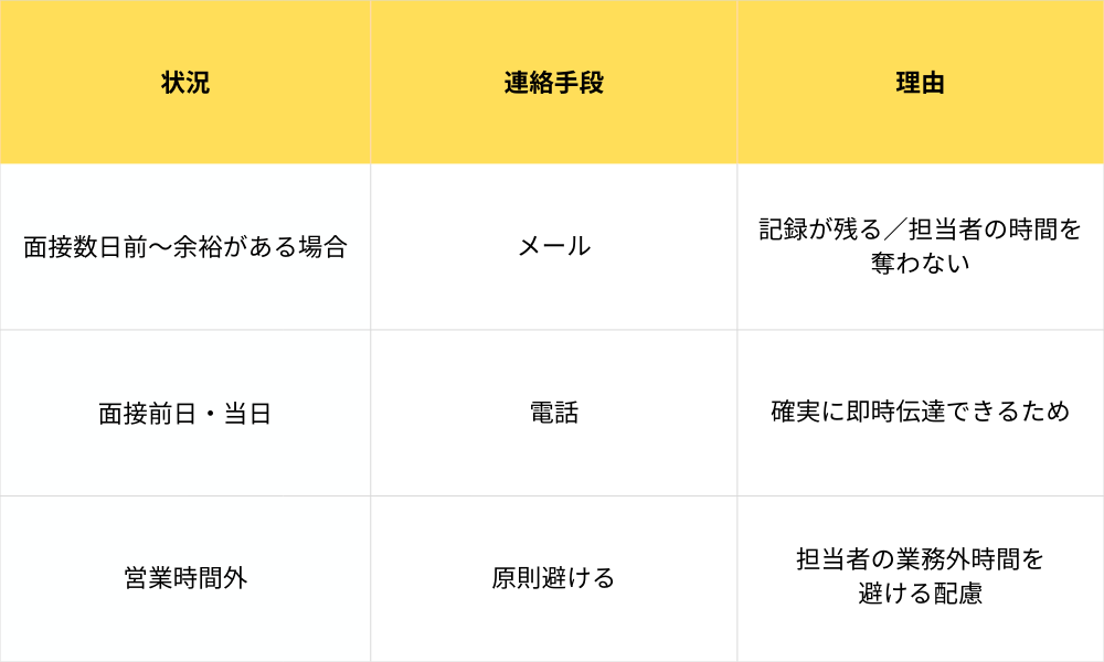 しかし、面接辞退の連絡が「前日」や「当日」になってしまう場合は、話が別です。この場合はメールではなく、必ず「電話」で連絡をしましょう。メールの場合、人事担当者が他の膨大なメールに紛れて見落としていたり、面接の準備でメールチェックをする時間がなかったりと、面接の時間までに確認してもらえない可能性があるためです。当日のドタキャンや無断欠席(サイレント辞退)と誤解されないよう、急を要する場合は直接声を届けるのが鉄則です。