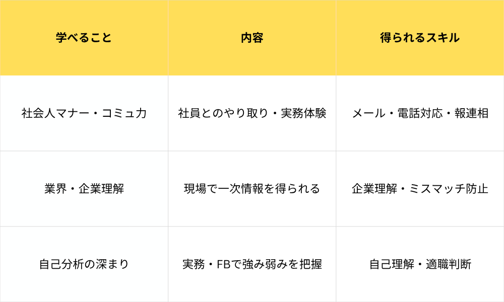 インターンシップで学べることは非常に多くあります。社会人マナー・業界理解・自己分析の深まりという3つの学びに加え、社会人基礎力・人脈・グローバル経験といったメリットも得られます。参加することで就活が有利になるだけでなく、入社後の自信にもつながります。