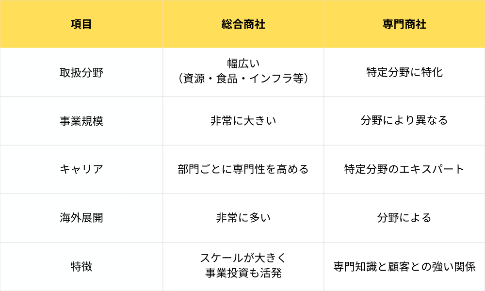 ここでは、総合商社と専門商社それぞれの特徴を解説します。
