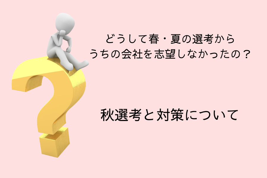 秋採用ならではの質問として「どうして秋採用に参加しているのか」「なぜ最初から志望しなかったのか」が聞かれます。責めているわけではなく、キャリアプランや本気度を図るために行われています。